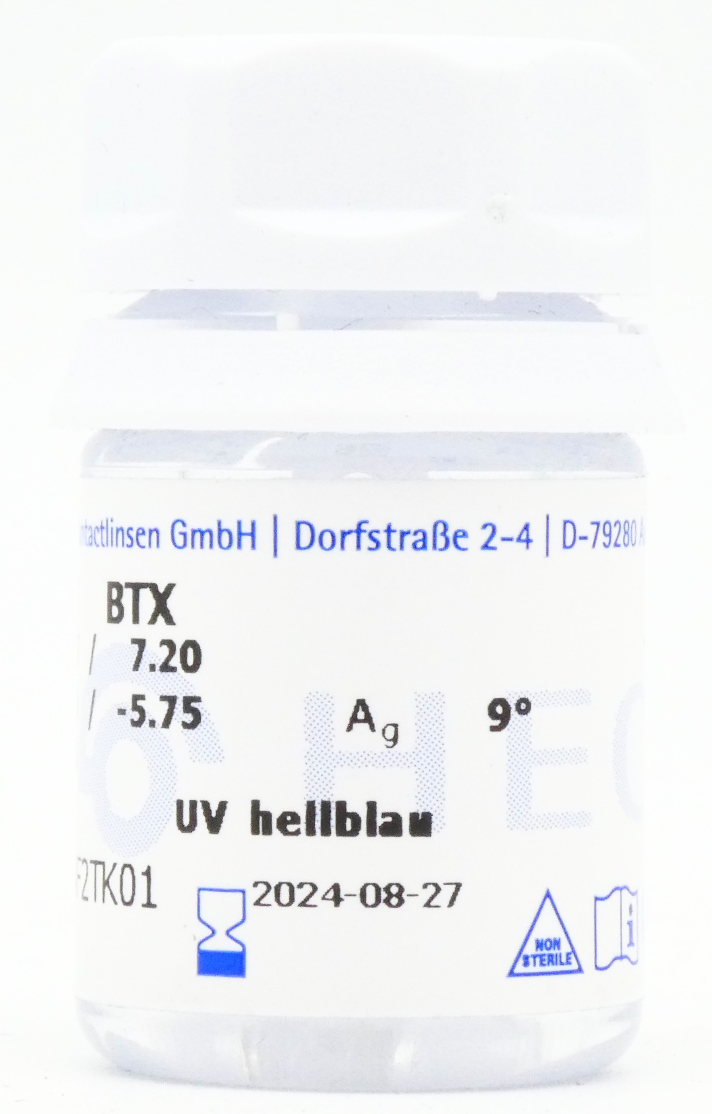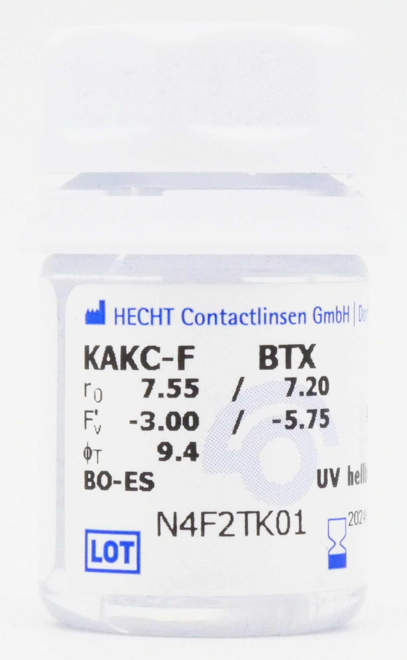 Die Hecht KAKC F - BTX ist eine bitorische formstabile Keratokonus Kontaktlinse bei mittleren bis hohen Hornhautastigmatismen. Die torische Rückfläche der Kontaktlinse sorgt für eine optimale Passform, hier mit einer zum Rand besonders flachen Geometrie, während die torische Vorderfläche der Kontaktlinse für die gute Sicht sorgt. Die Hecht KAKC - F BTX erzielt einen optimalen Tragekomfort durch den Randdickenangleich, der eine einheitliche Randdicke erzielt.