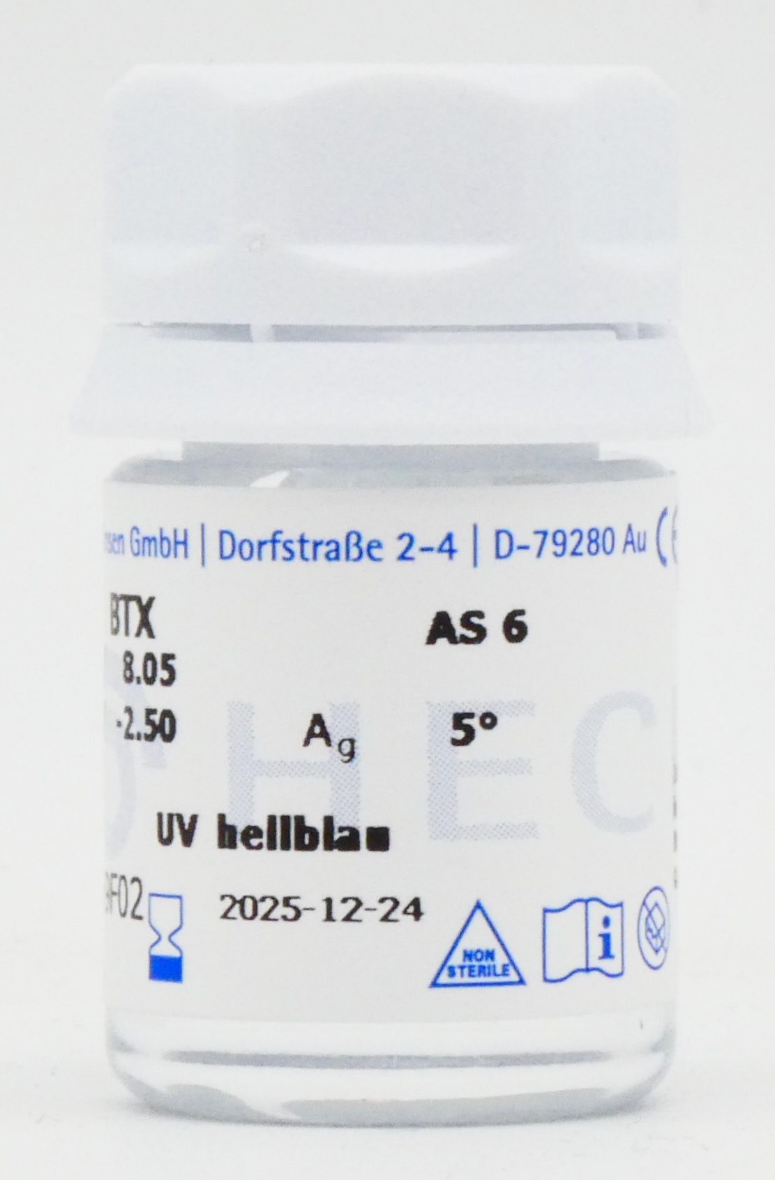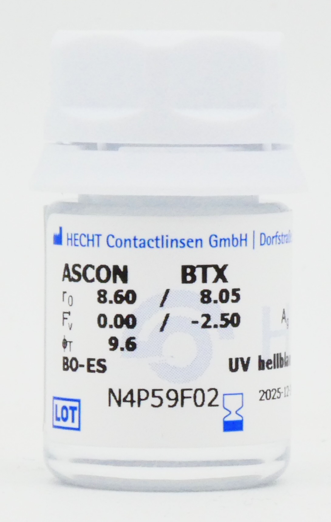 Die Hecht ASCON® - BTX ist eine bitorisch schiefgekreuzte formstabile Kontaktlinse bei mittleren bis hohen Hornhautastigmatismen. Die torische Rückfläche gleicht die torische Vorderfläche der Hornhaut aus. Die torische Vorderfläche der Linse wirkt dadurch sphärisch.. Die Hecht ASCON® - BTX erzielt einen optimalen Tragekomfort durch den Randdickenangleich, der eine einheitliche Randdicke erzielt. Weltweit patentierte asphärische Rückfläche, das Original, da erste asphärische Hartlinse. ABBILDUNG ÄHNLICH !