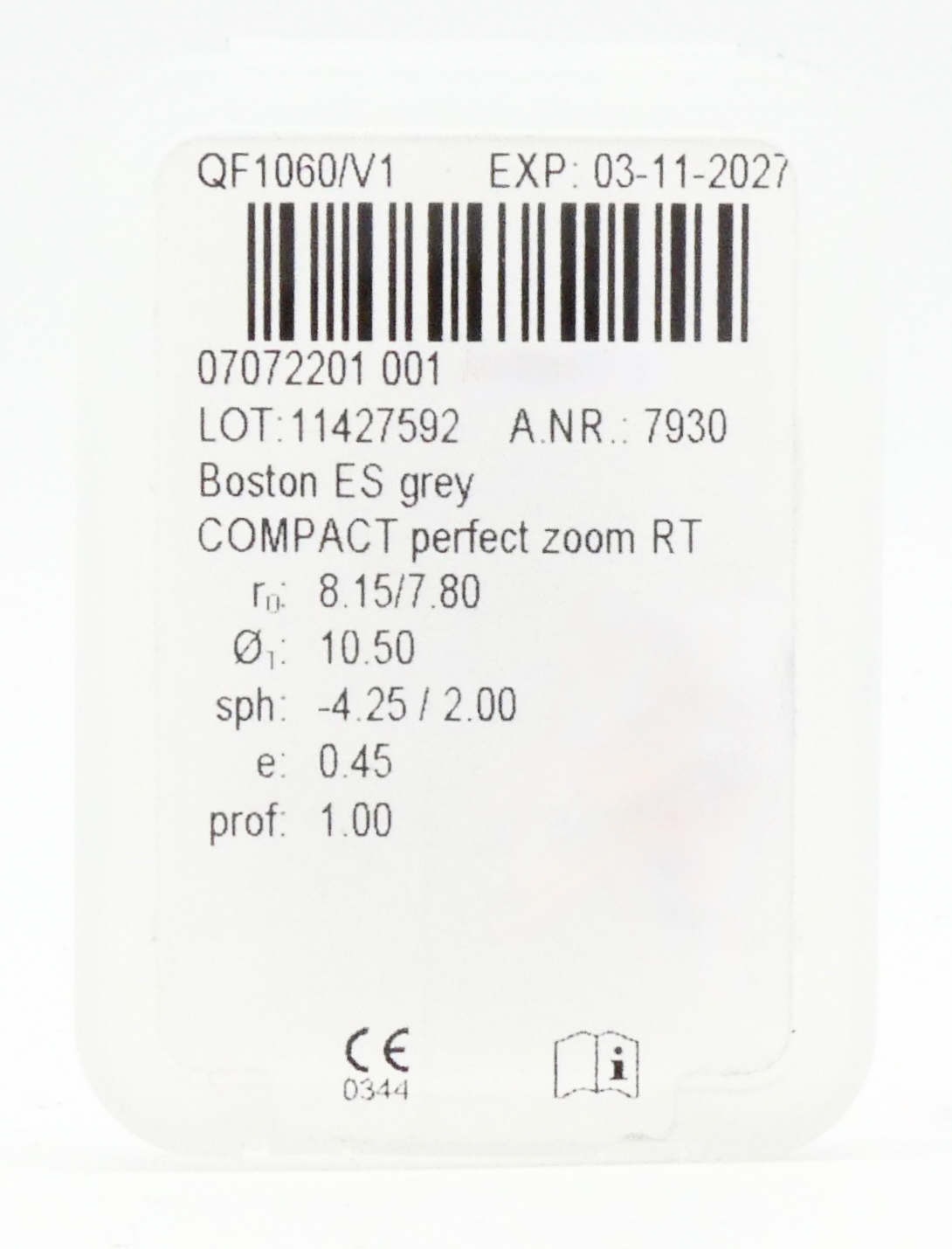Die hartflexible Contactlinse Müller-Welt compact perfect zoom RT von MPG&E, ist eine multifokale rücktorische formstabile Kontaktlinse und wird dann anwendet, wenn die Hornhautform zu unterschiedlich ist, und die Standard Kontaktlinse perfect zoom kein gutes Sitzverhalten zeigt. Die unterschiedlich geformte Rückfläche der harten Linse