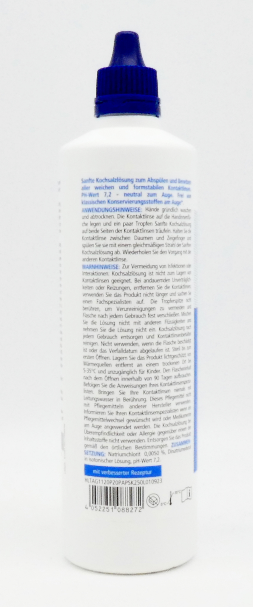 250ml sanfte Kochsalzlösung zum Abspülen und Benetzen aller weichen und formstabilen Kontaktlinsen.