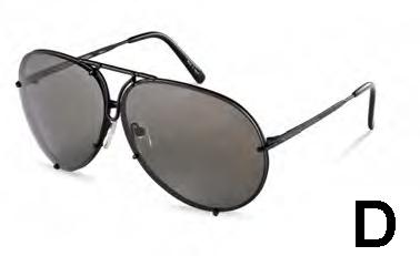 - D: Fassung schwarz mattiert, Gläser oliv 87%-silber verspiegelt und braun 89% (Mod. P 8478 D, P'8478 D)